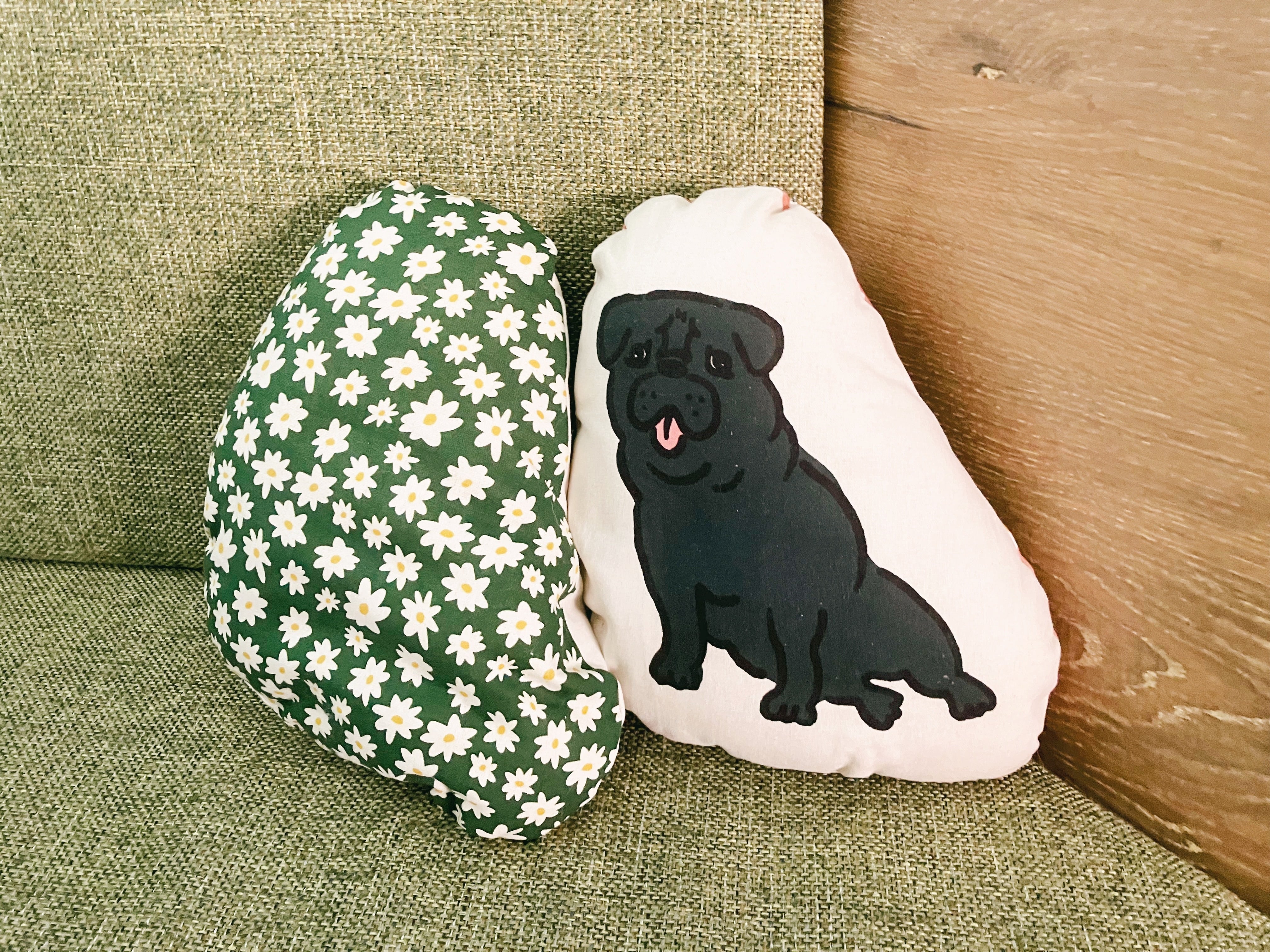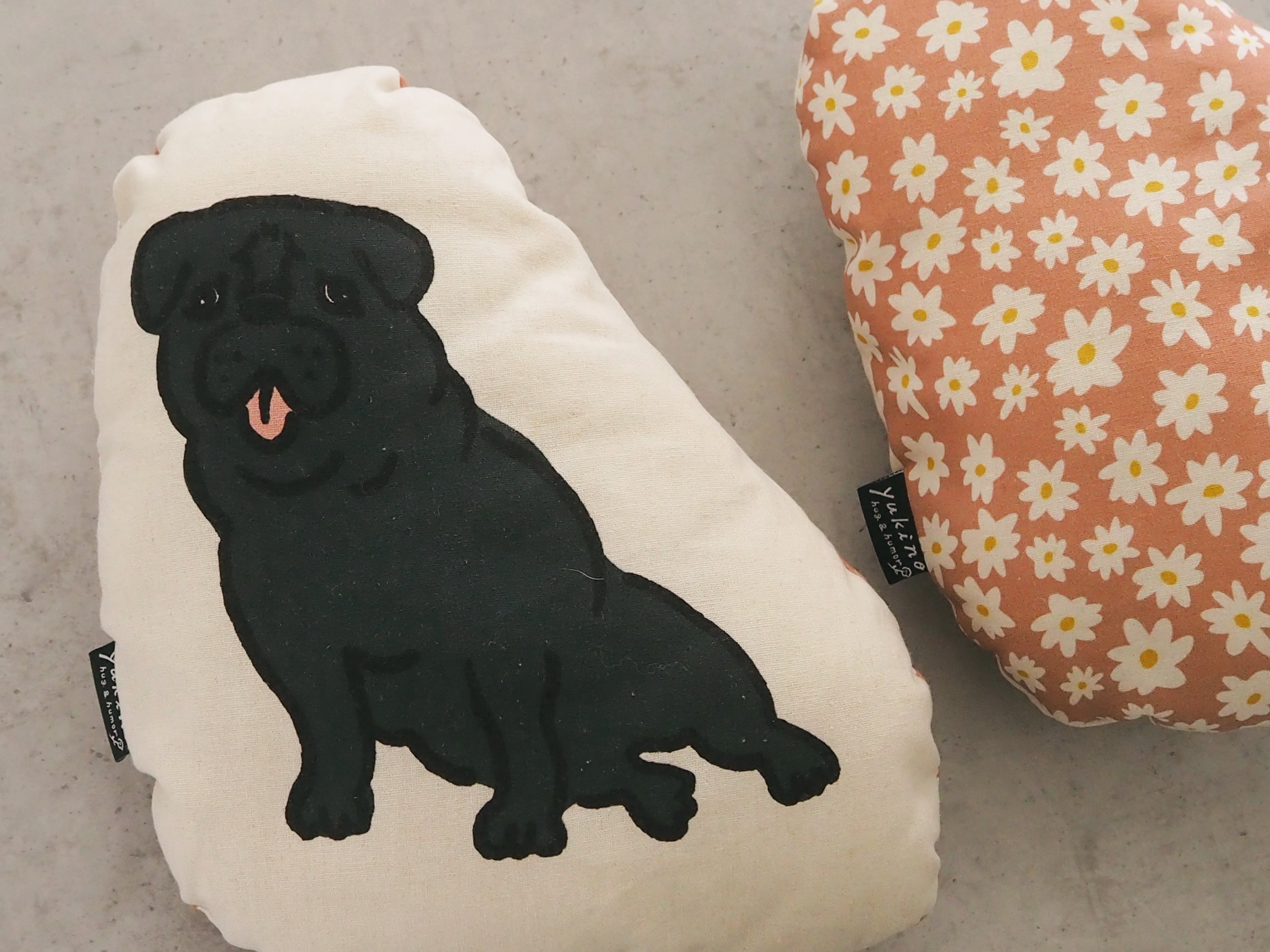 小ぶりのサイズがパグの枕にぴったり?な、ダイカットミニクッションです。
