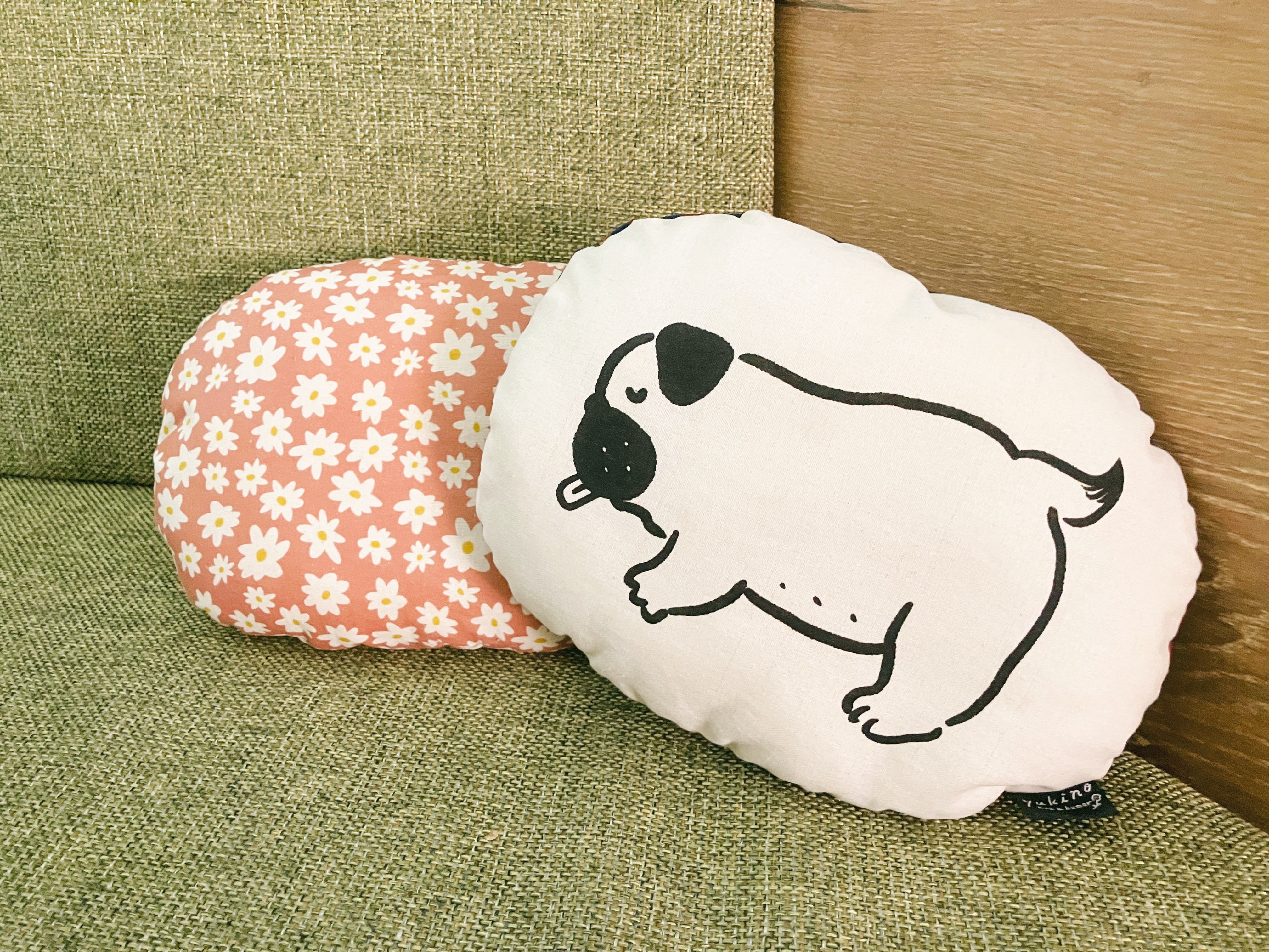 小ぶりのサイズがパグの枕にぴったり?ダイカットミニクッションです。