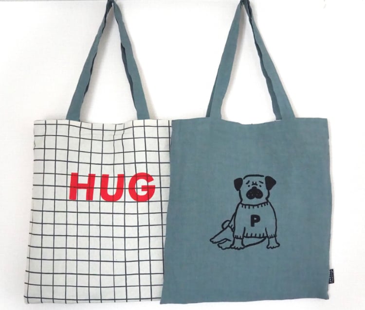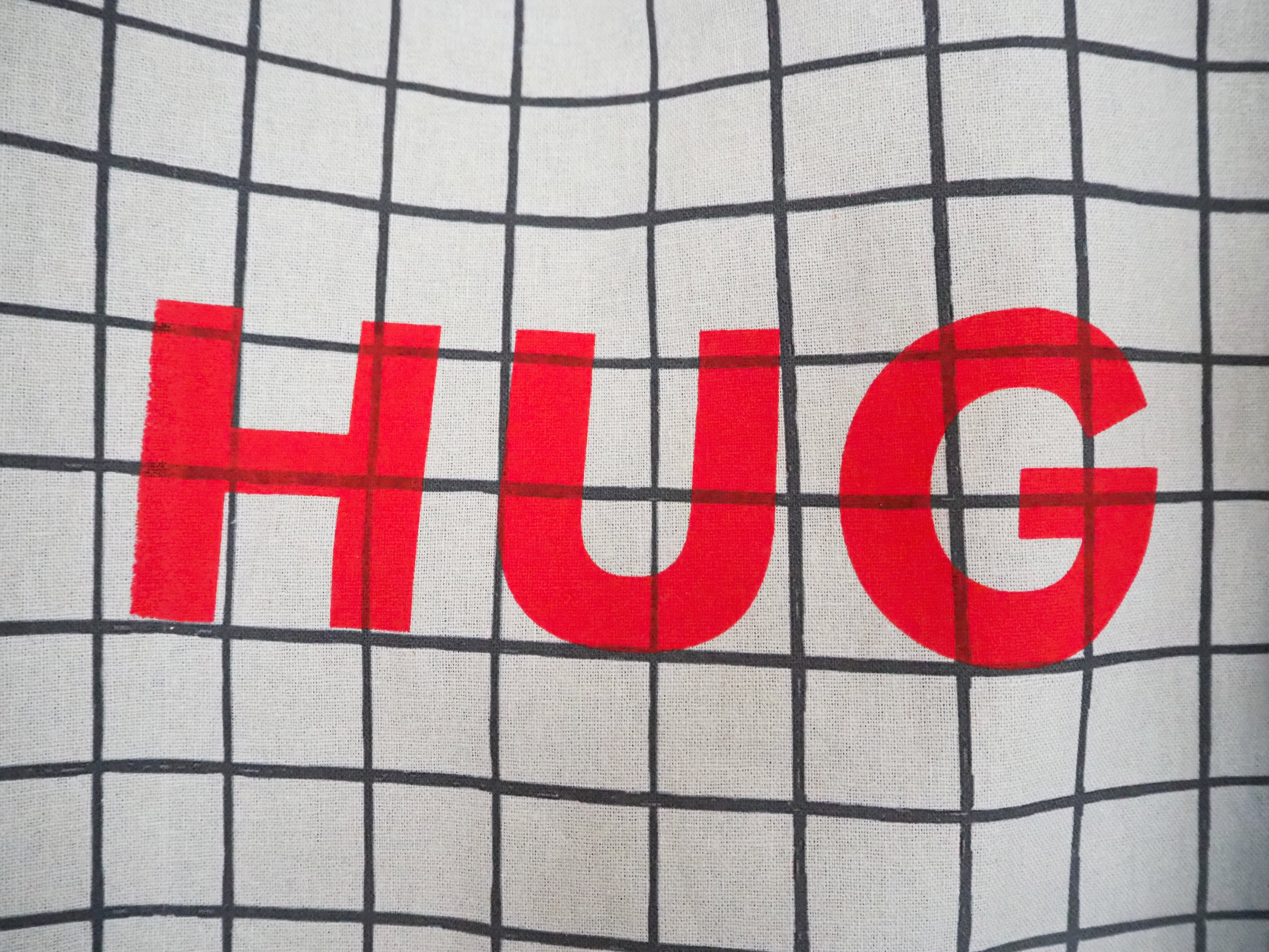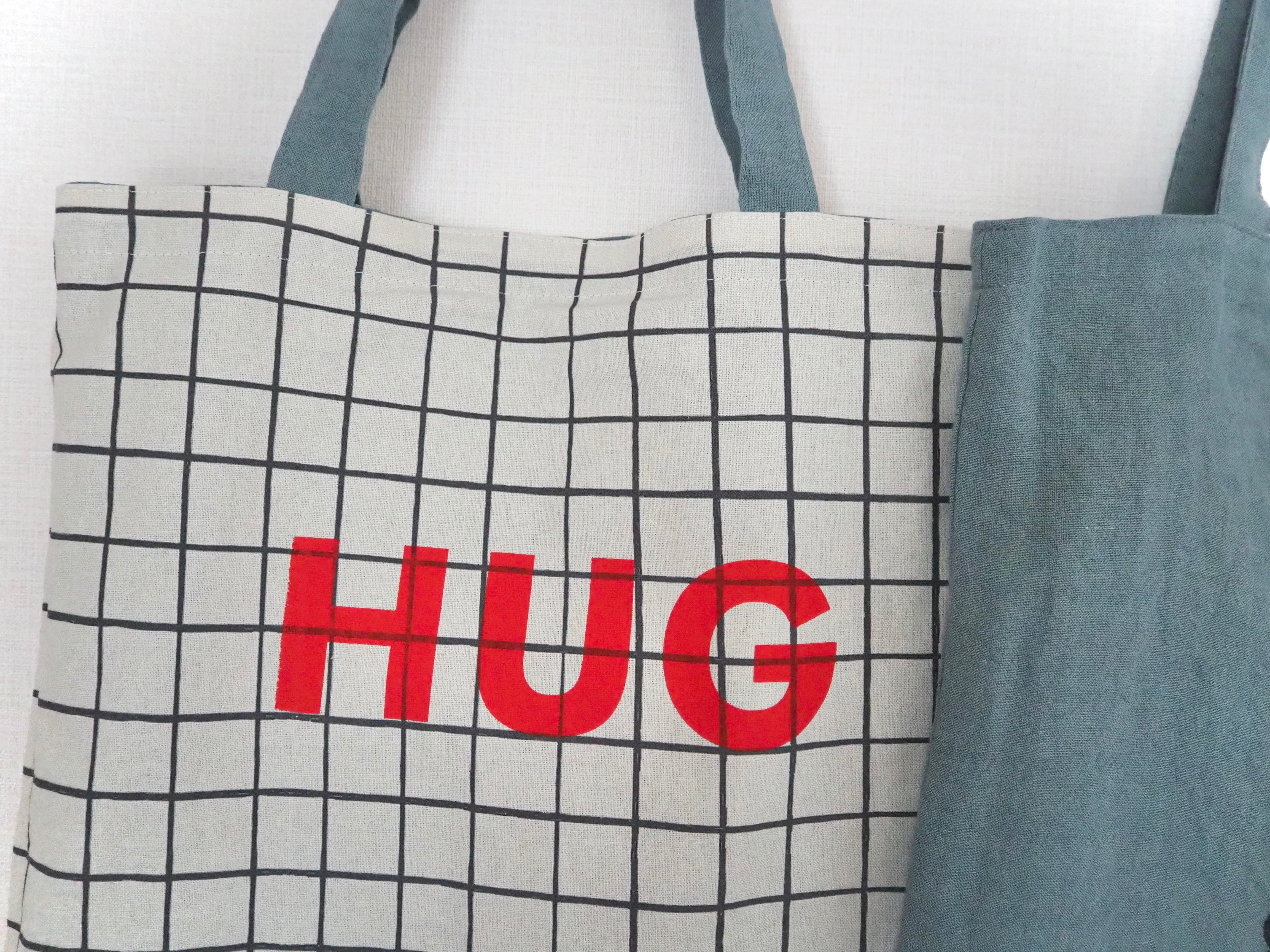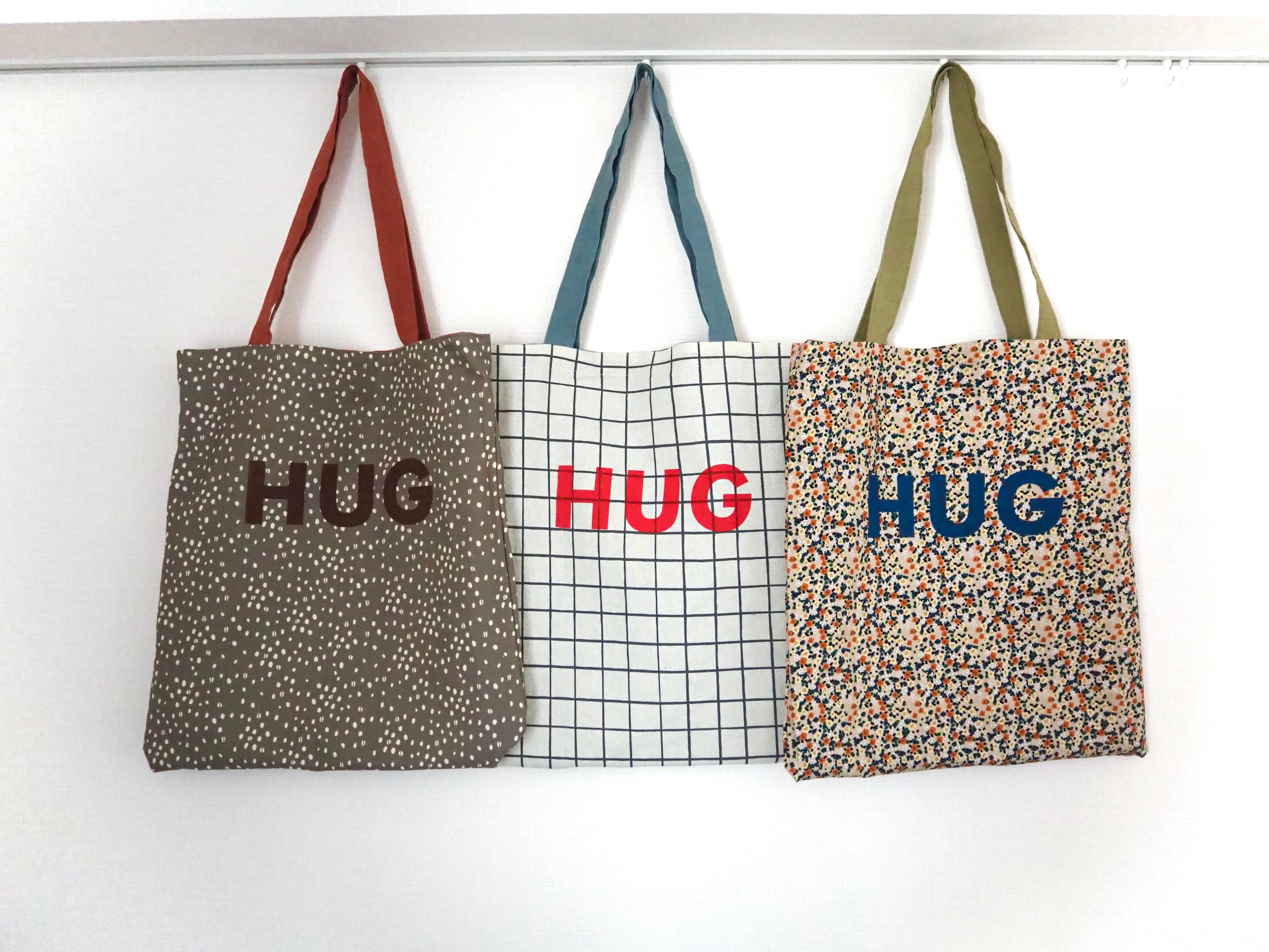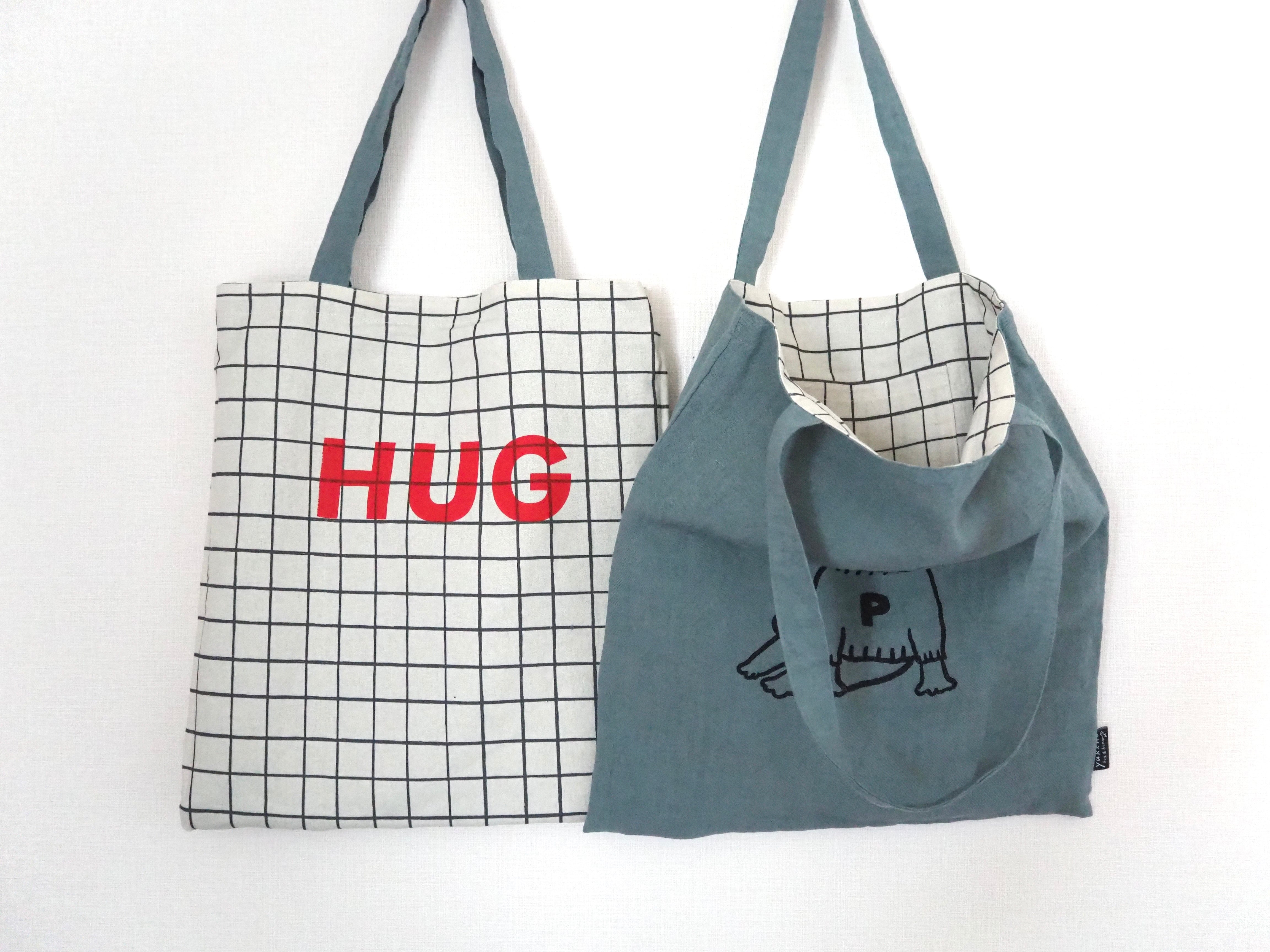 リバーシブル仕様で、オリジナル柄のコットンリネンには「HUG」のロゴ入り。