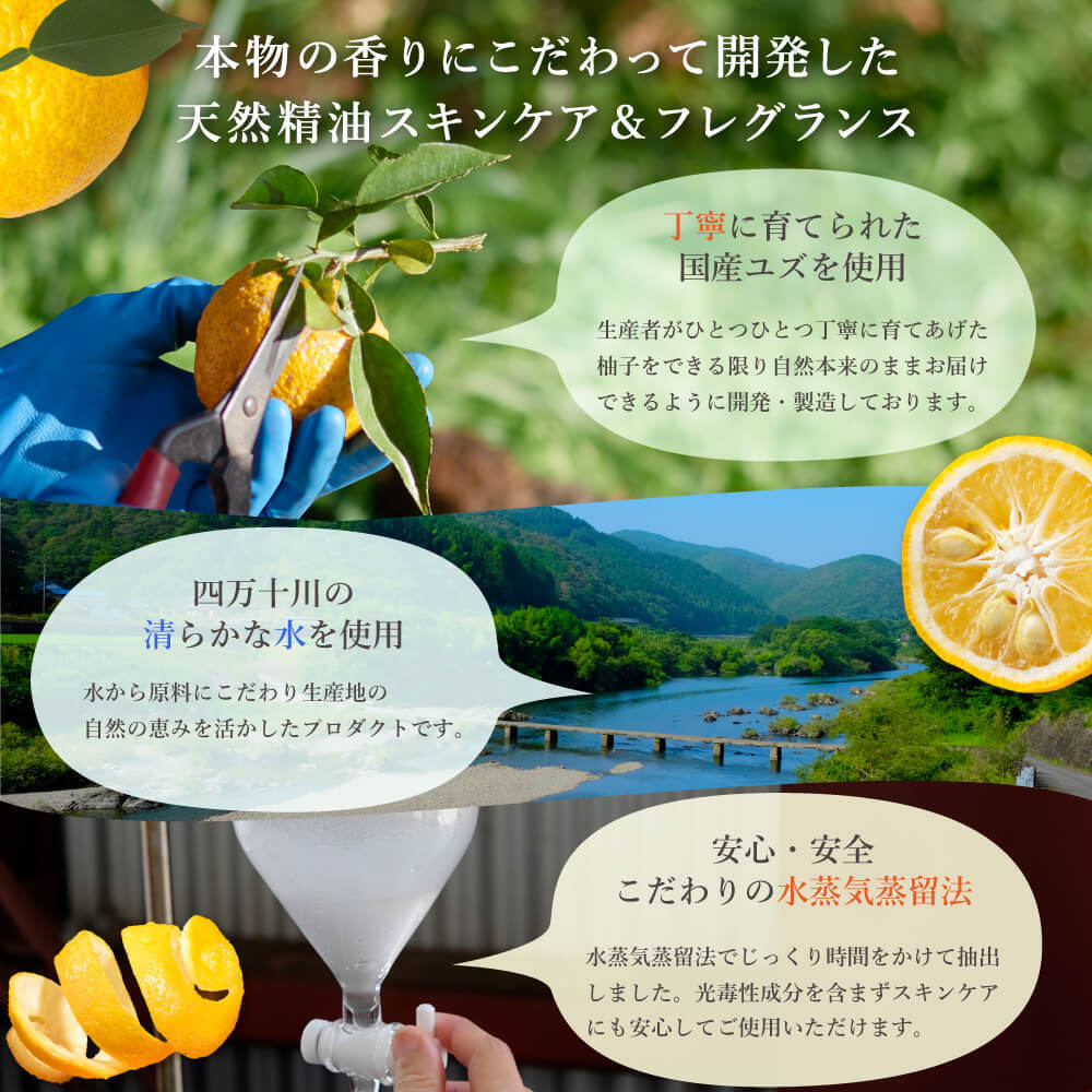 豊かな自然からの恵み、高知県産ユズと清らかな四万十川の水。本物の香りにこだわって、 一つひとつ大切に育てられたユズを四万十川の水を使用し、水蒸気蒸留法でていねいに抽出しました。