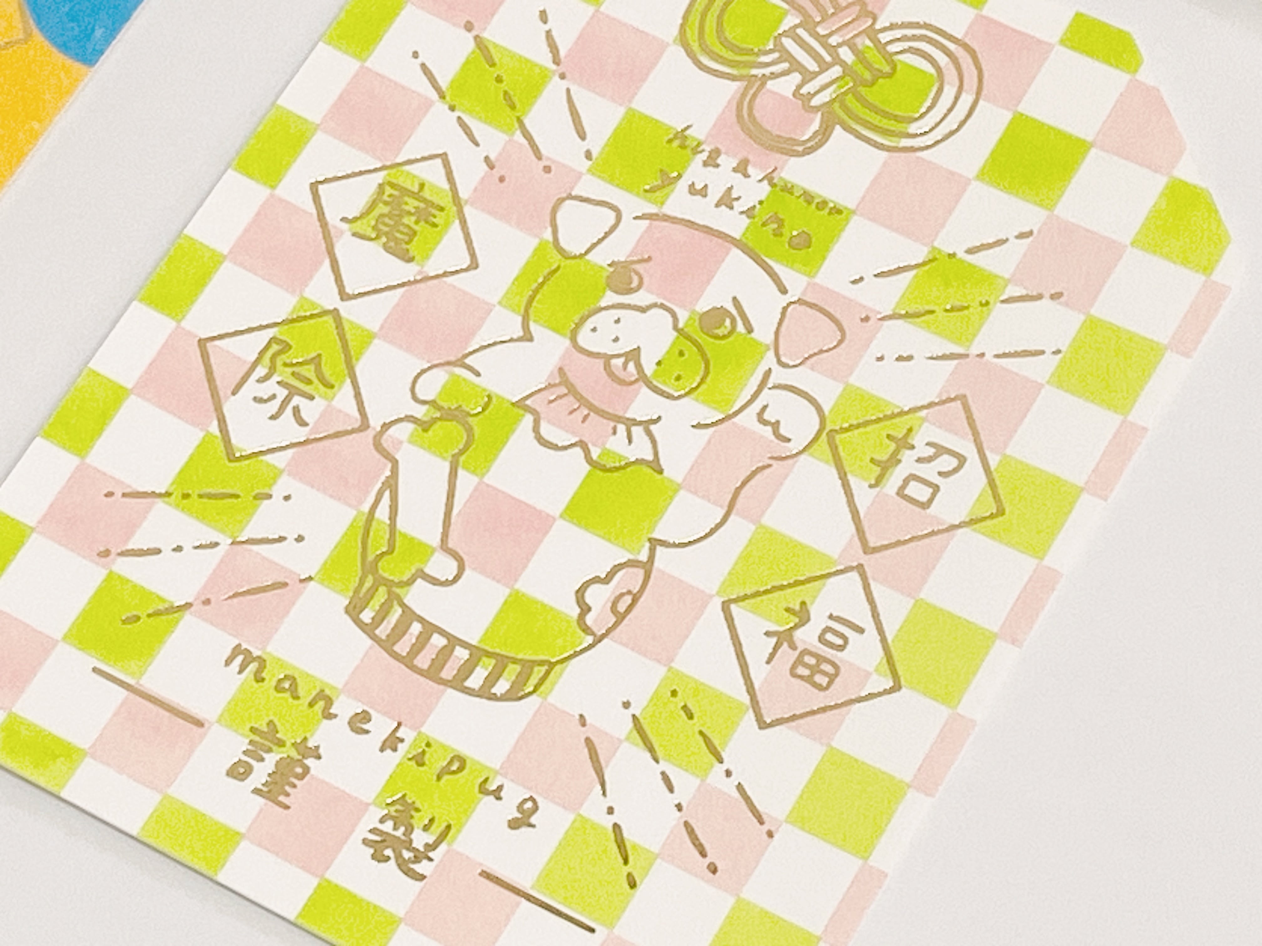 キラキラとした招きパグの箔押しが施されたこのカードは、特別なメッセージを添えるのにぴったり。