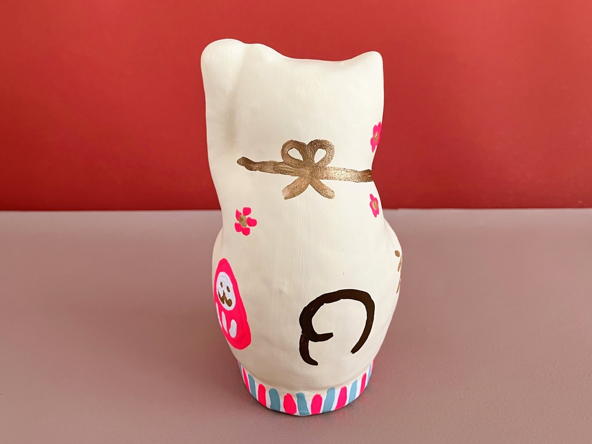 ・はりこの置物は紙製で軽い為土合部分を粘土で張り合わせているものがございます。土でできている為、割れやすくなっておりますので取り扱いに注意してください。