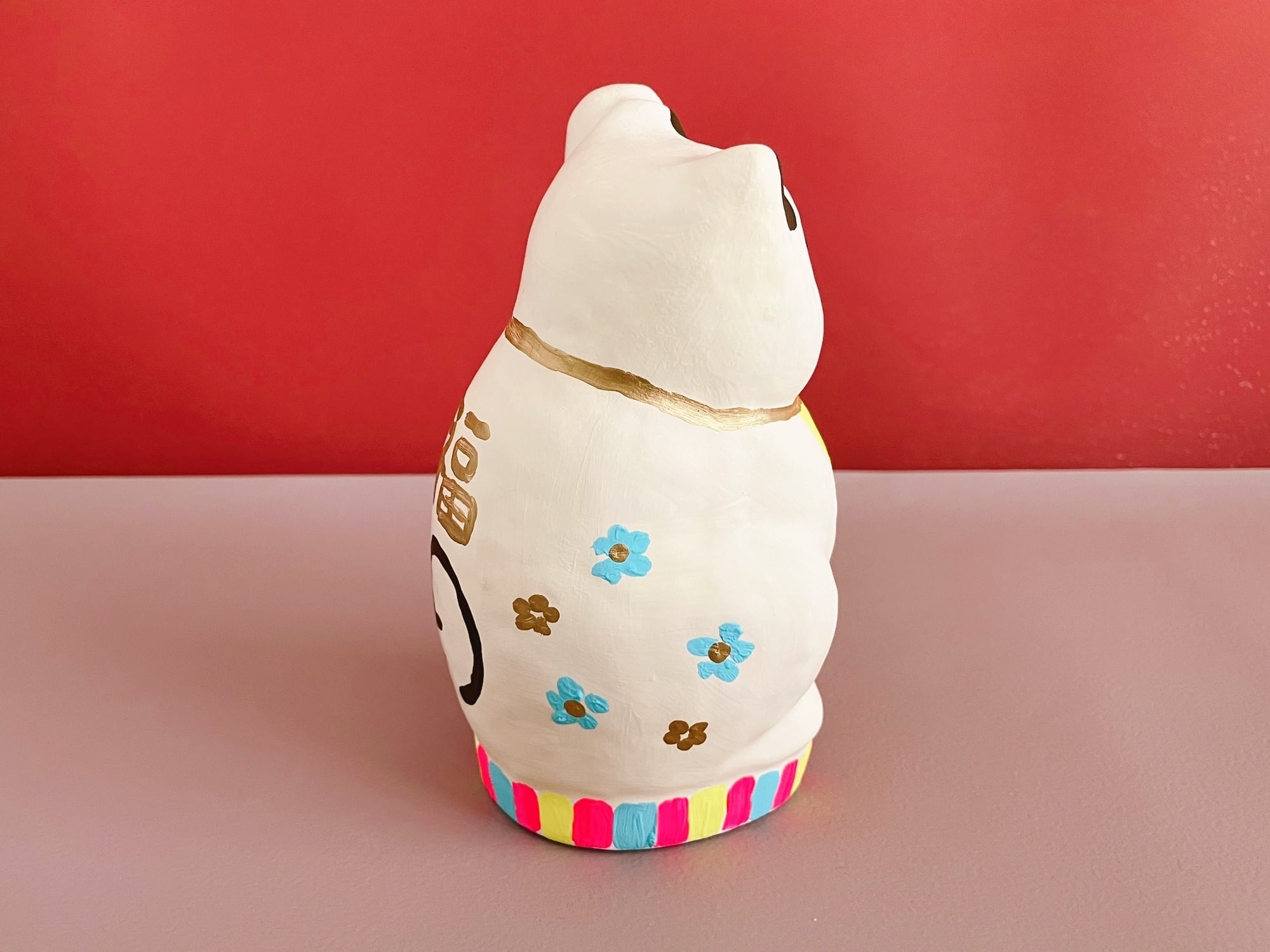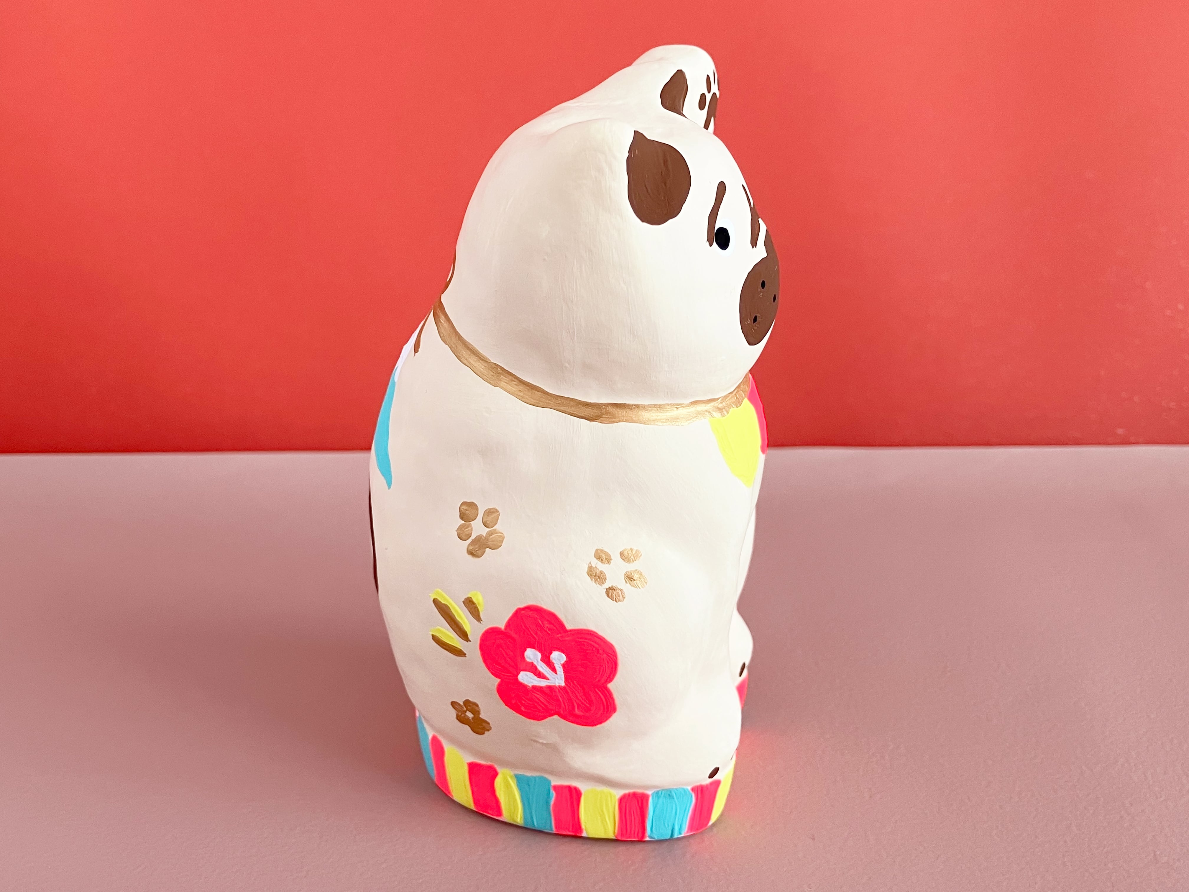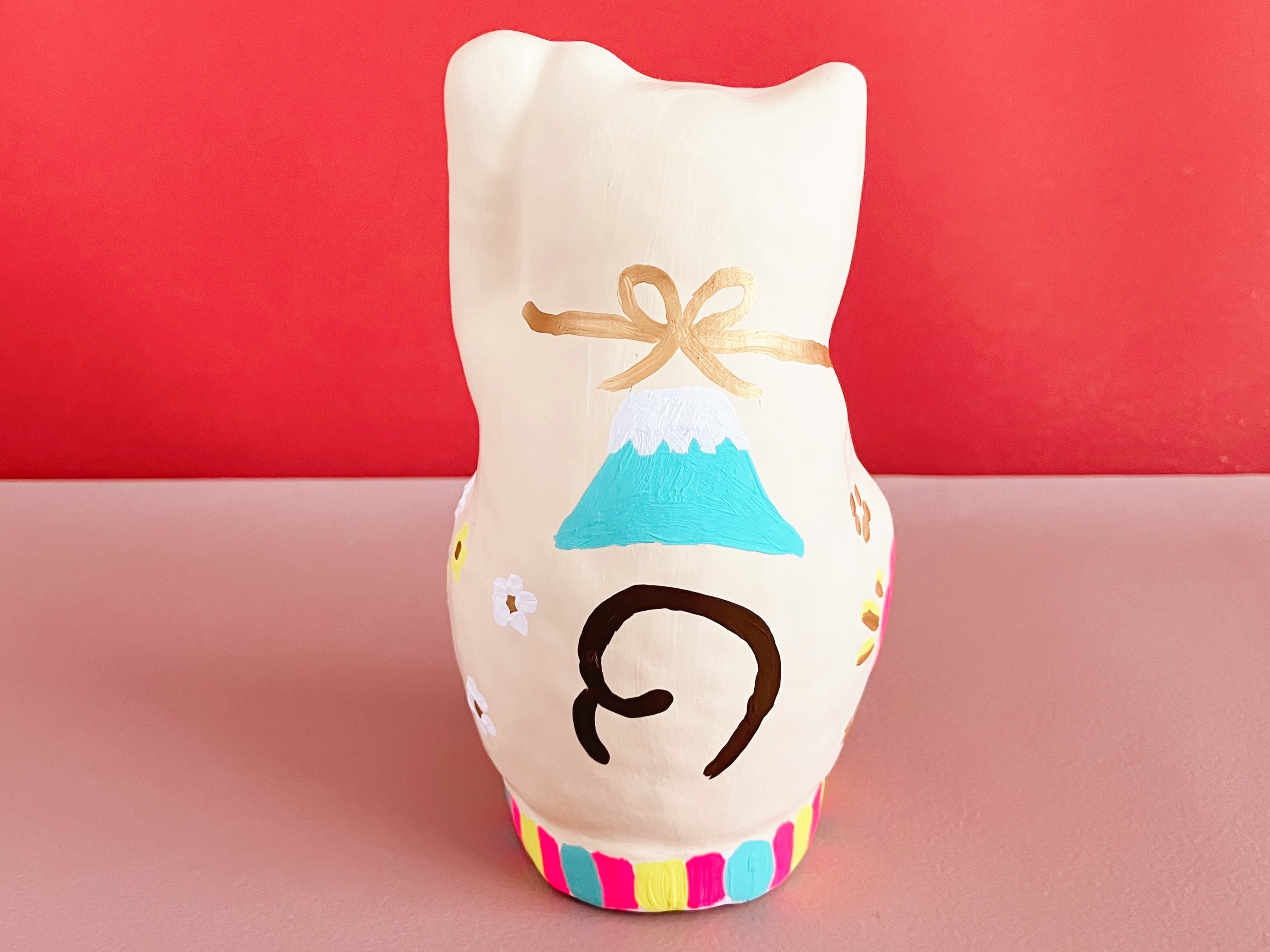 ・はりこの置物は紙製で軽い為土合部分を粘土で張り合わせているものがございます。土でできている為、割れやすくなっておりますので取り扱いに注意してください。