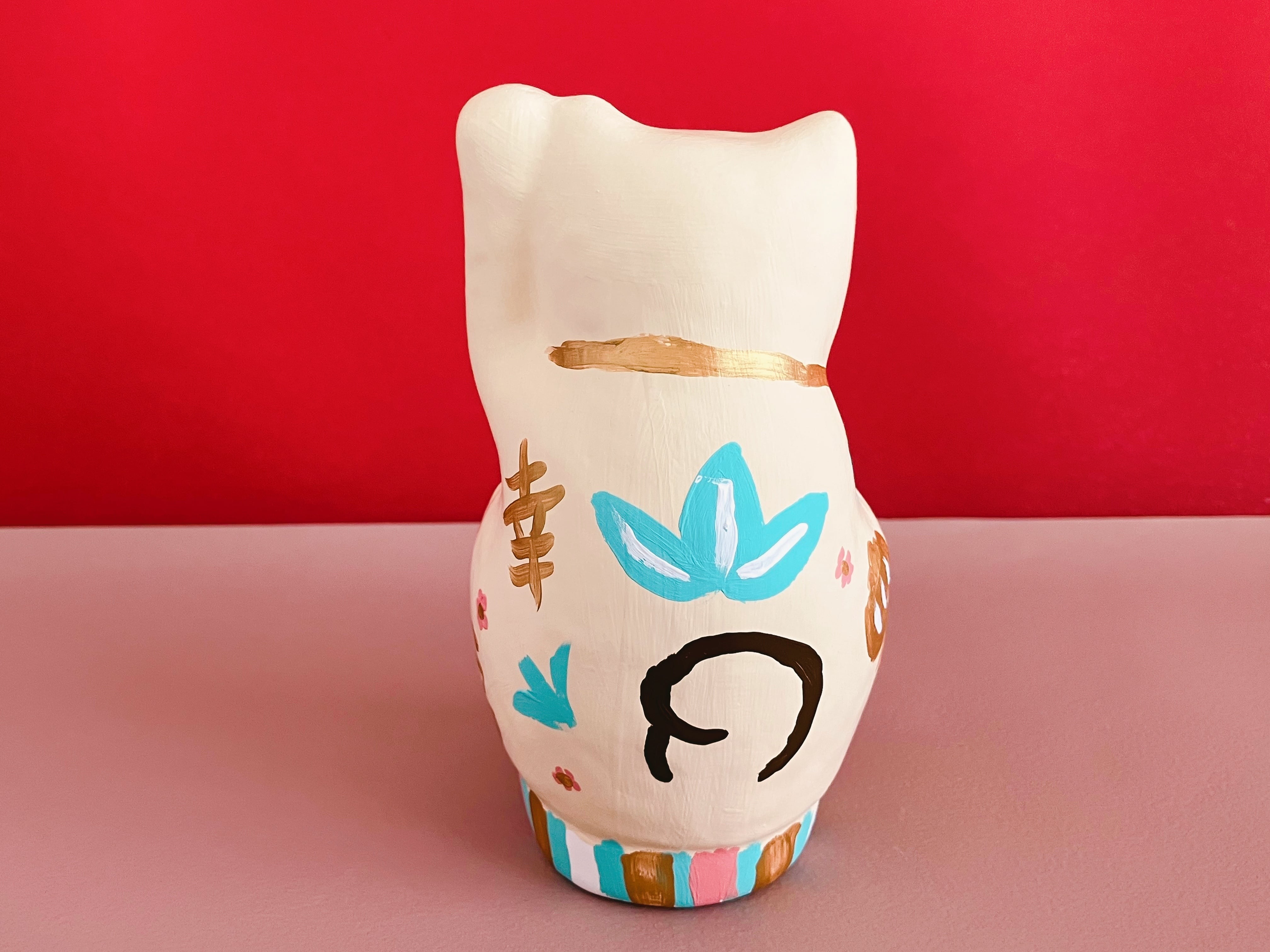 ・はりこの置物は紙製で軽い為土合部分を粘土で張り合わせているものがございます。土でできている為、割れやすくなっておりますので取り扱いに注意してください。