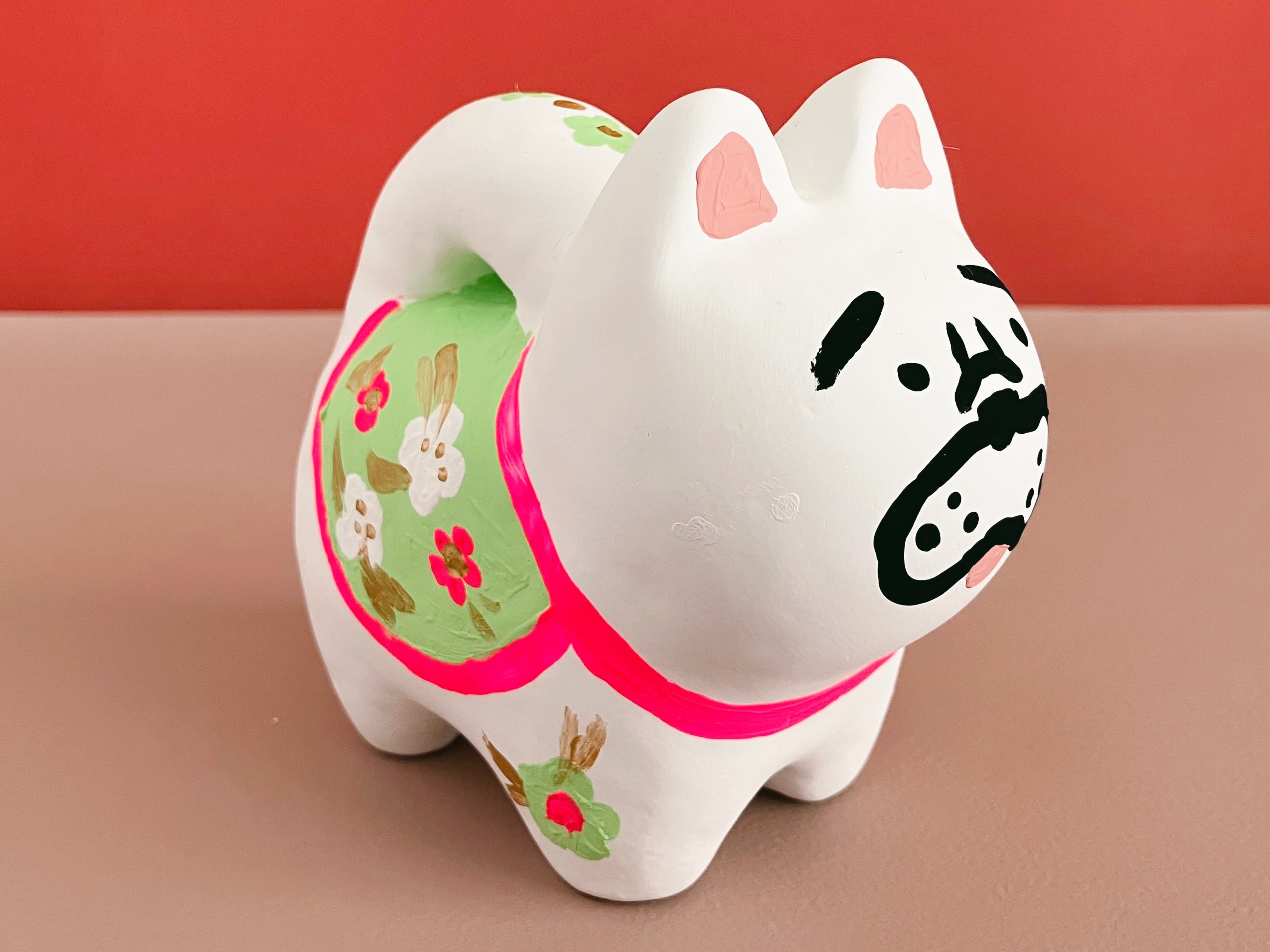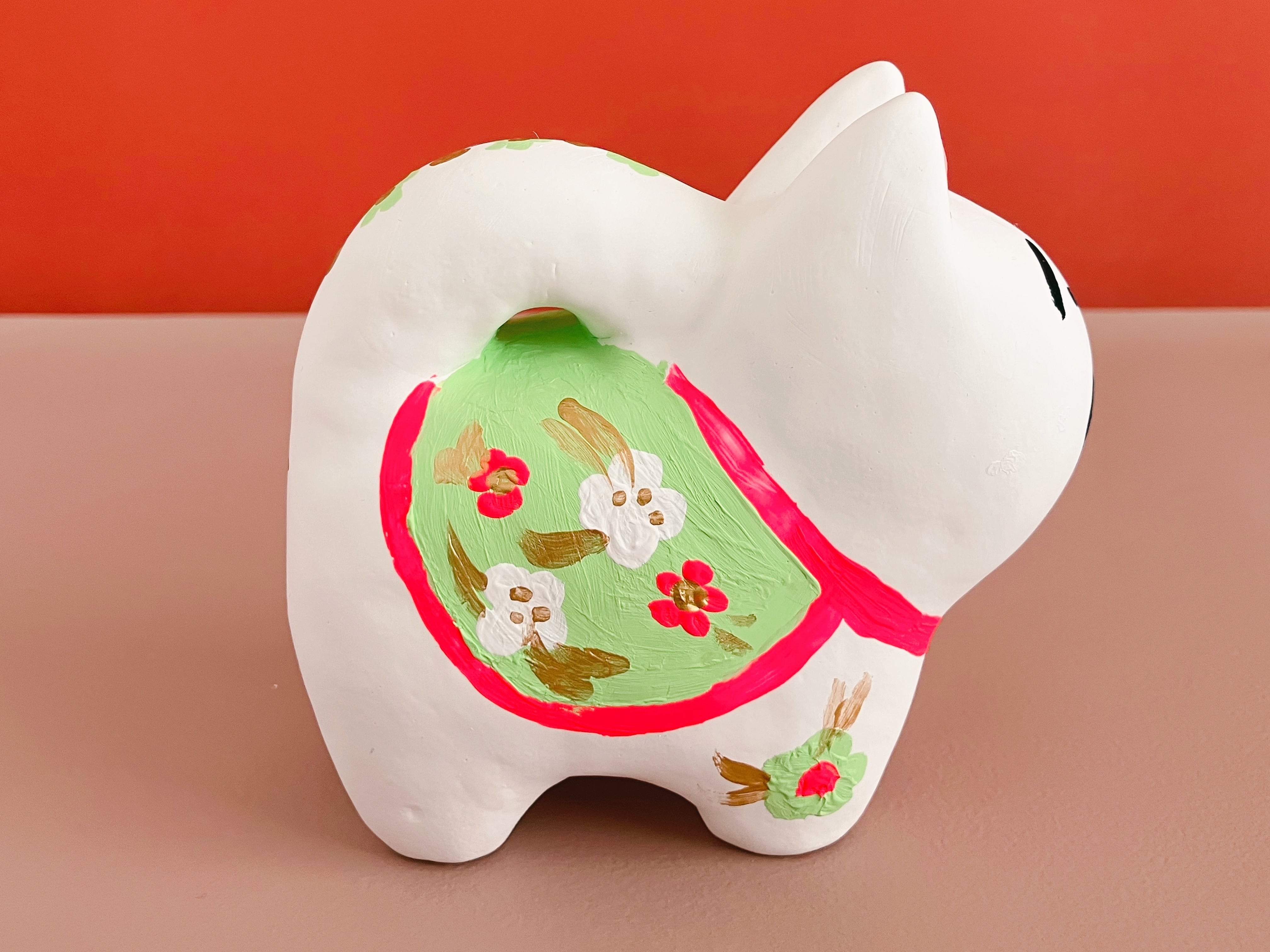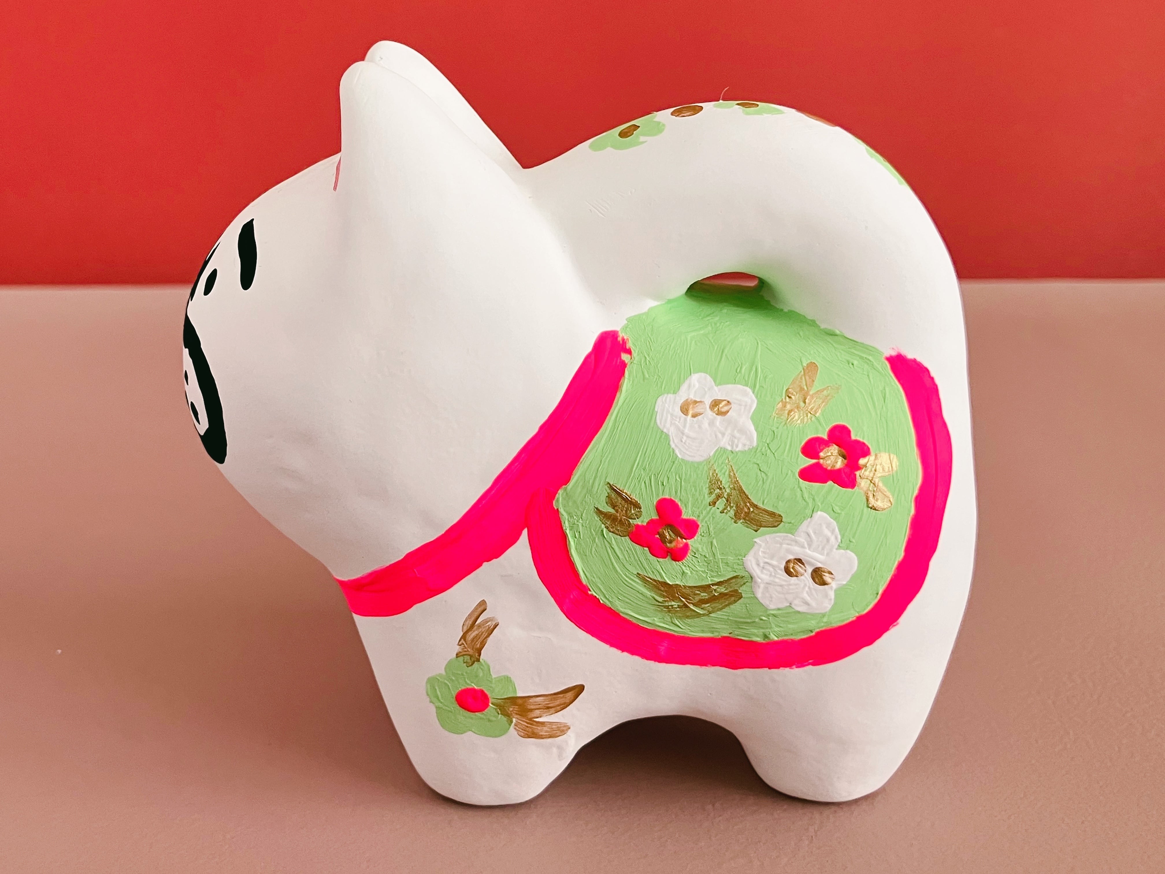 ・はりこの置物は紙製で軽い為土合部分を粘土で張り合わせているものがございます。土でできている為、割れやすくなっておりますので取り扱いに注意してください。
