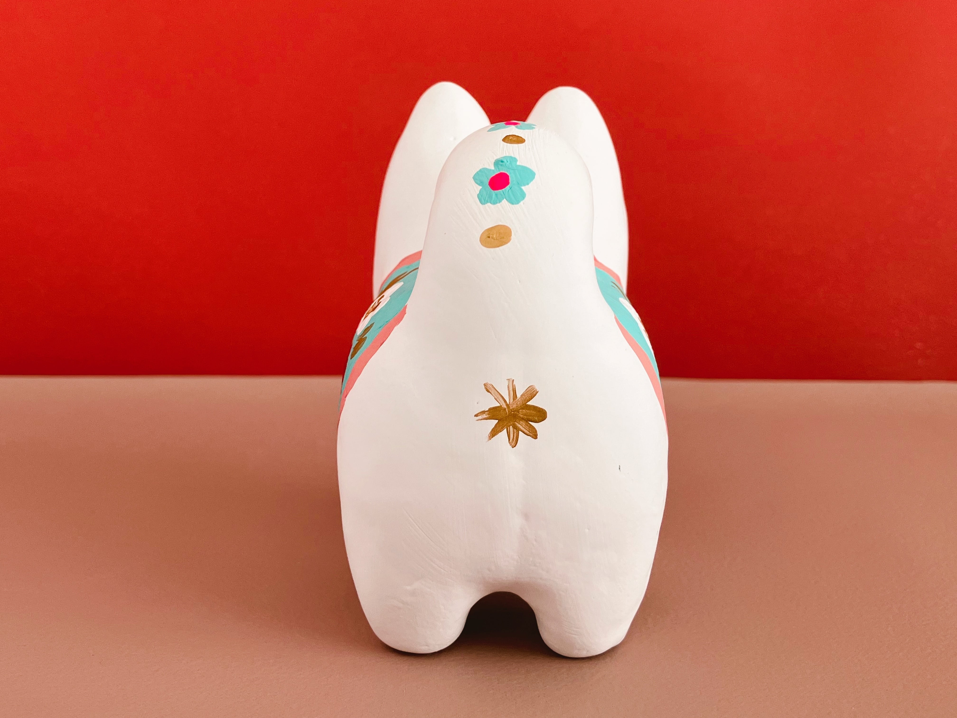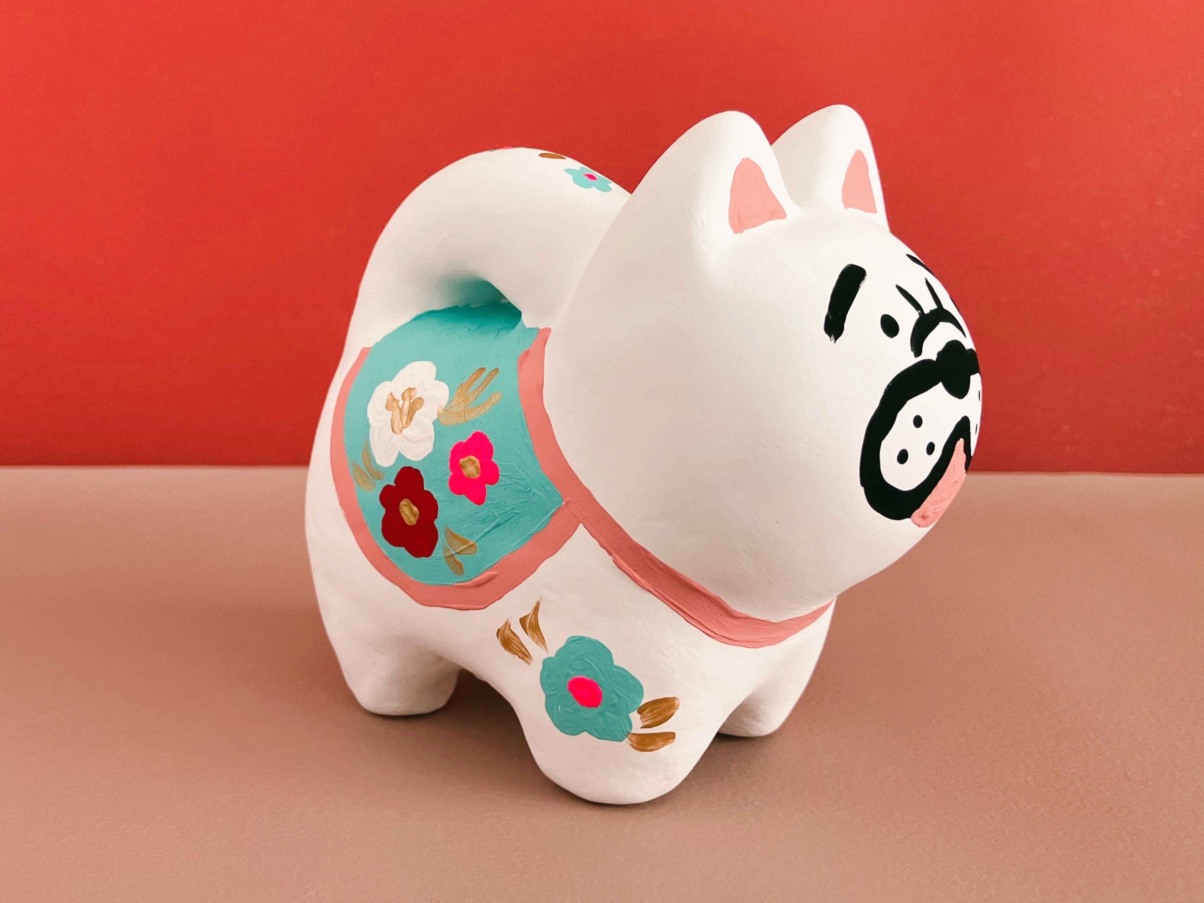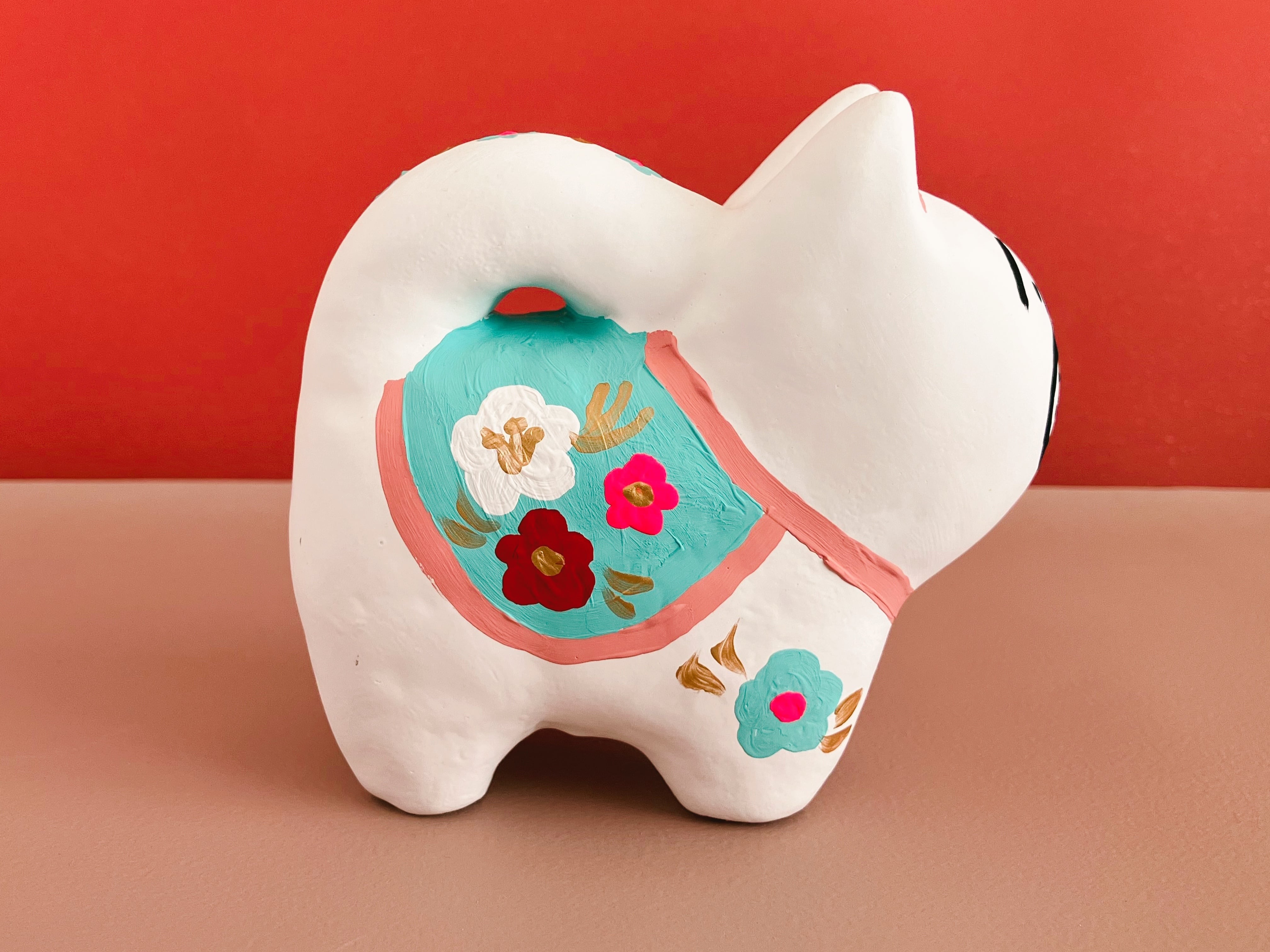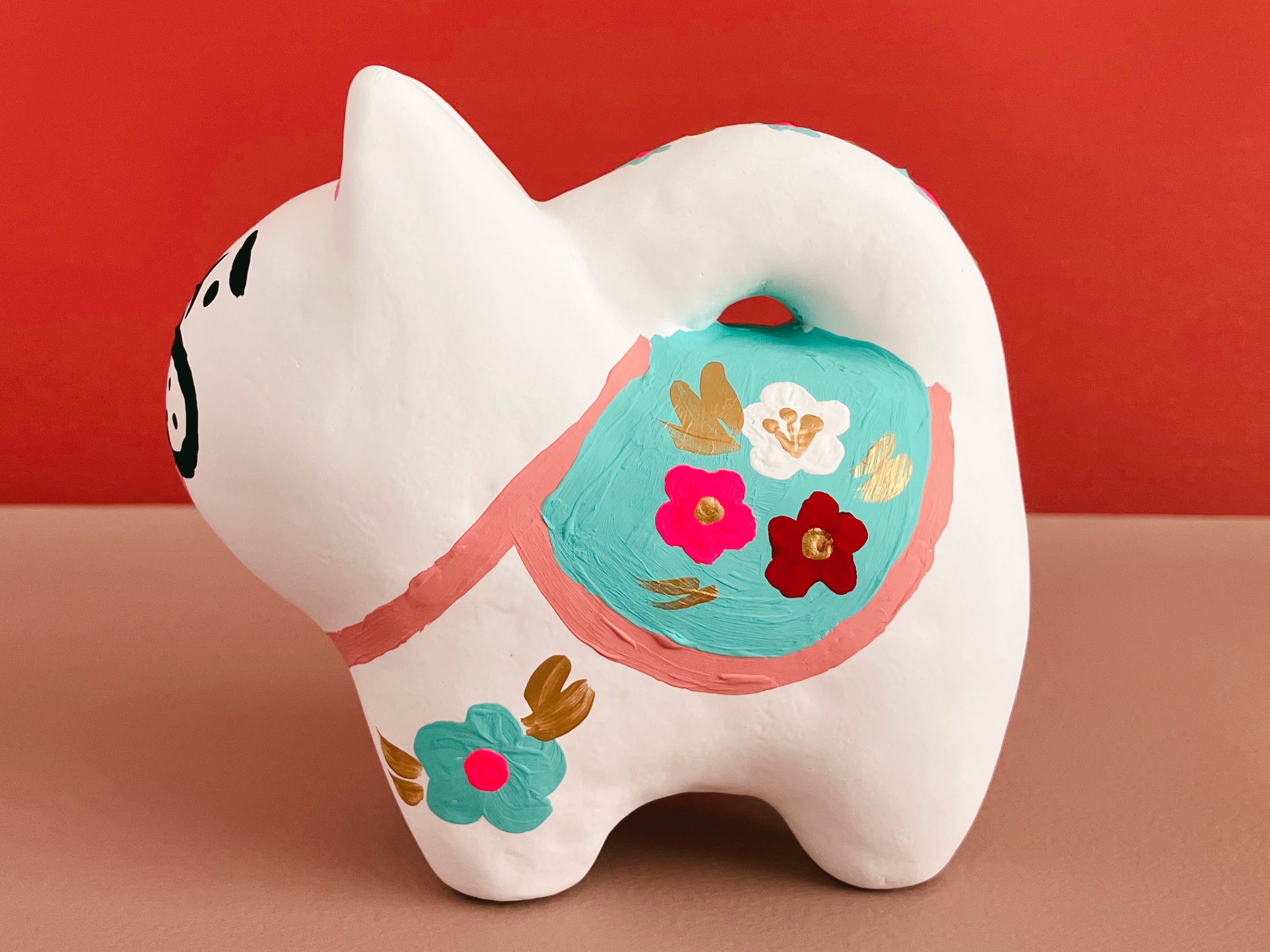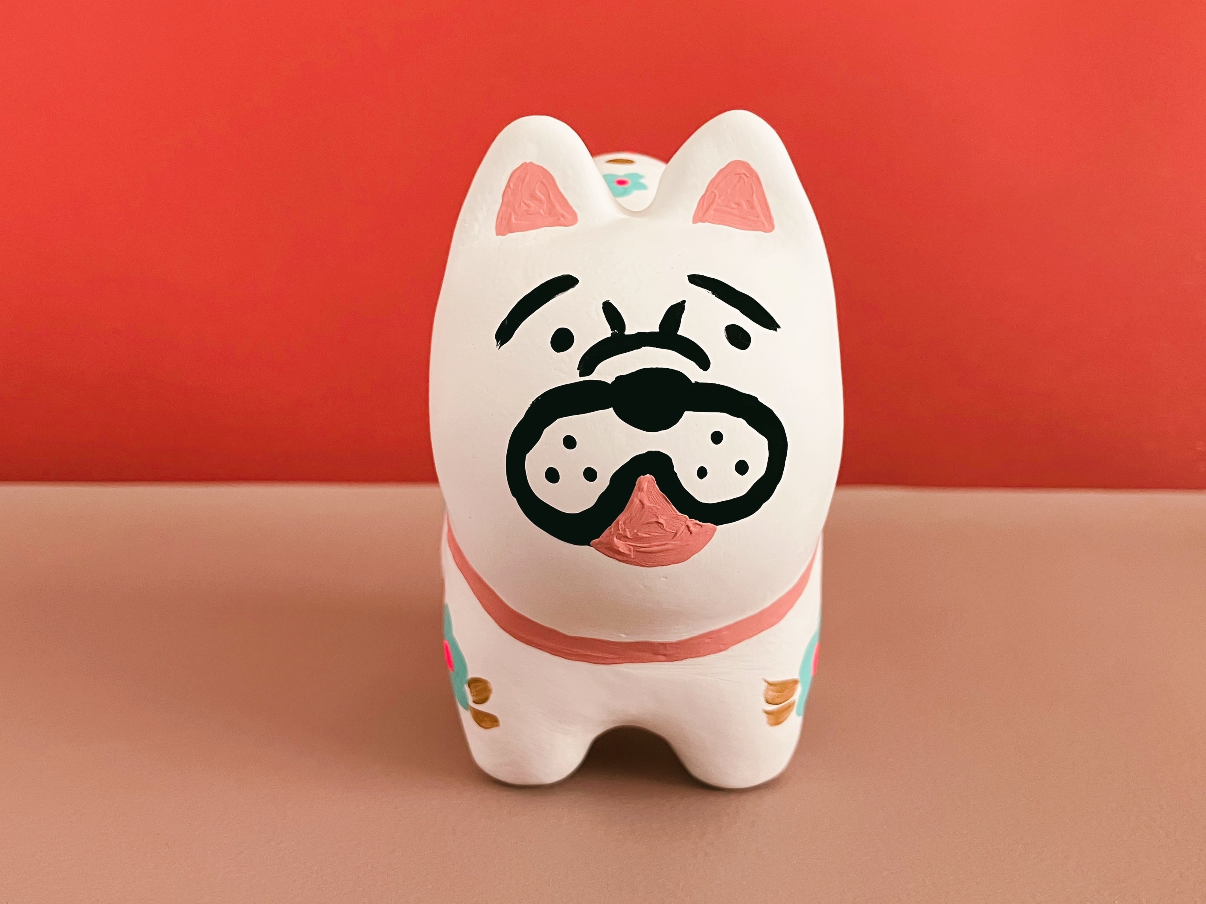 ・はりこの置物は紙製で軽い為土合部分を粘土で張り合わせているものがございます。土でできている為、割れやすくなっておりますので取り扱いに注意してください。