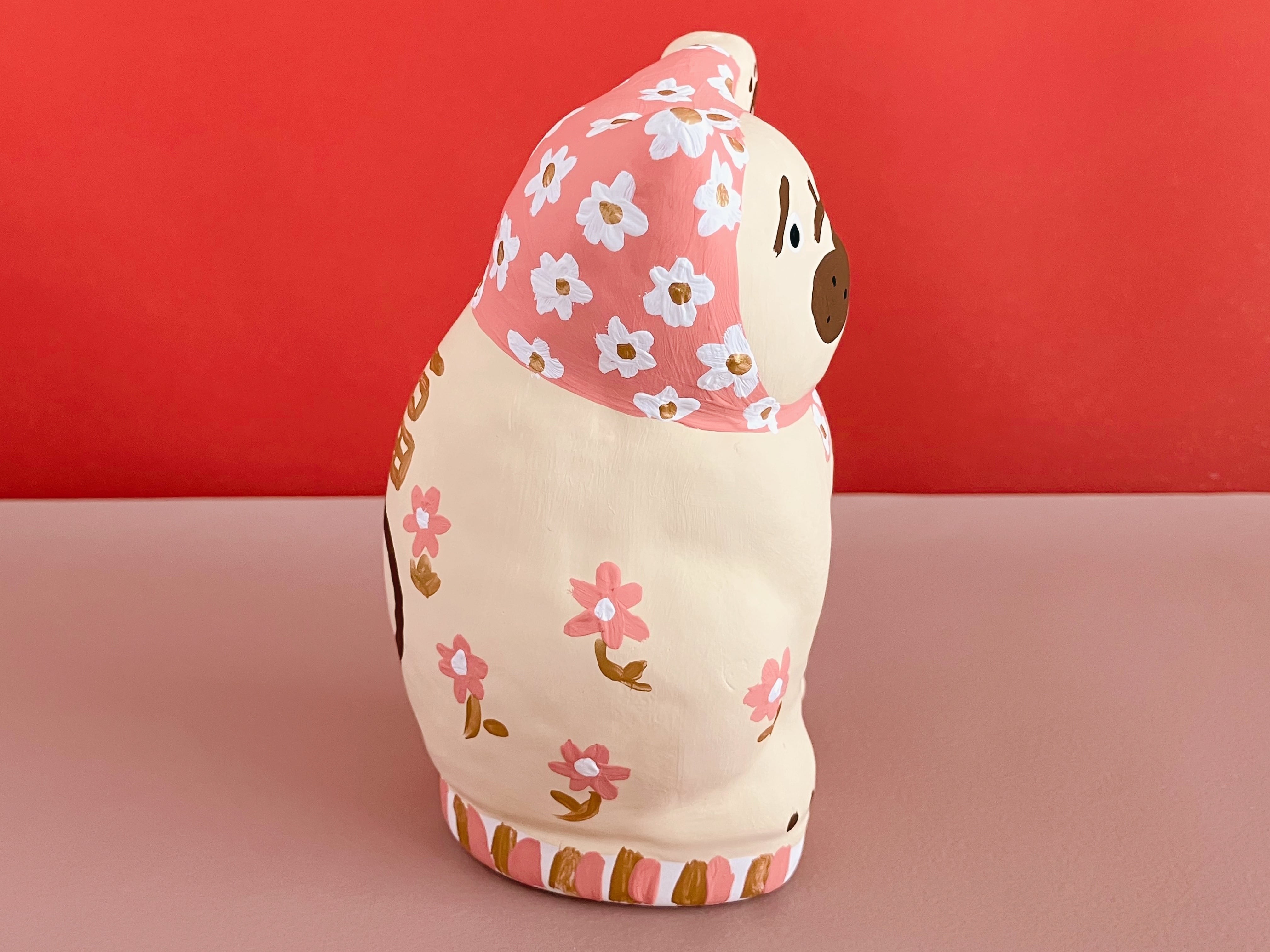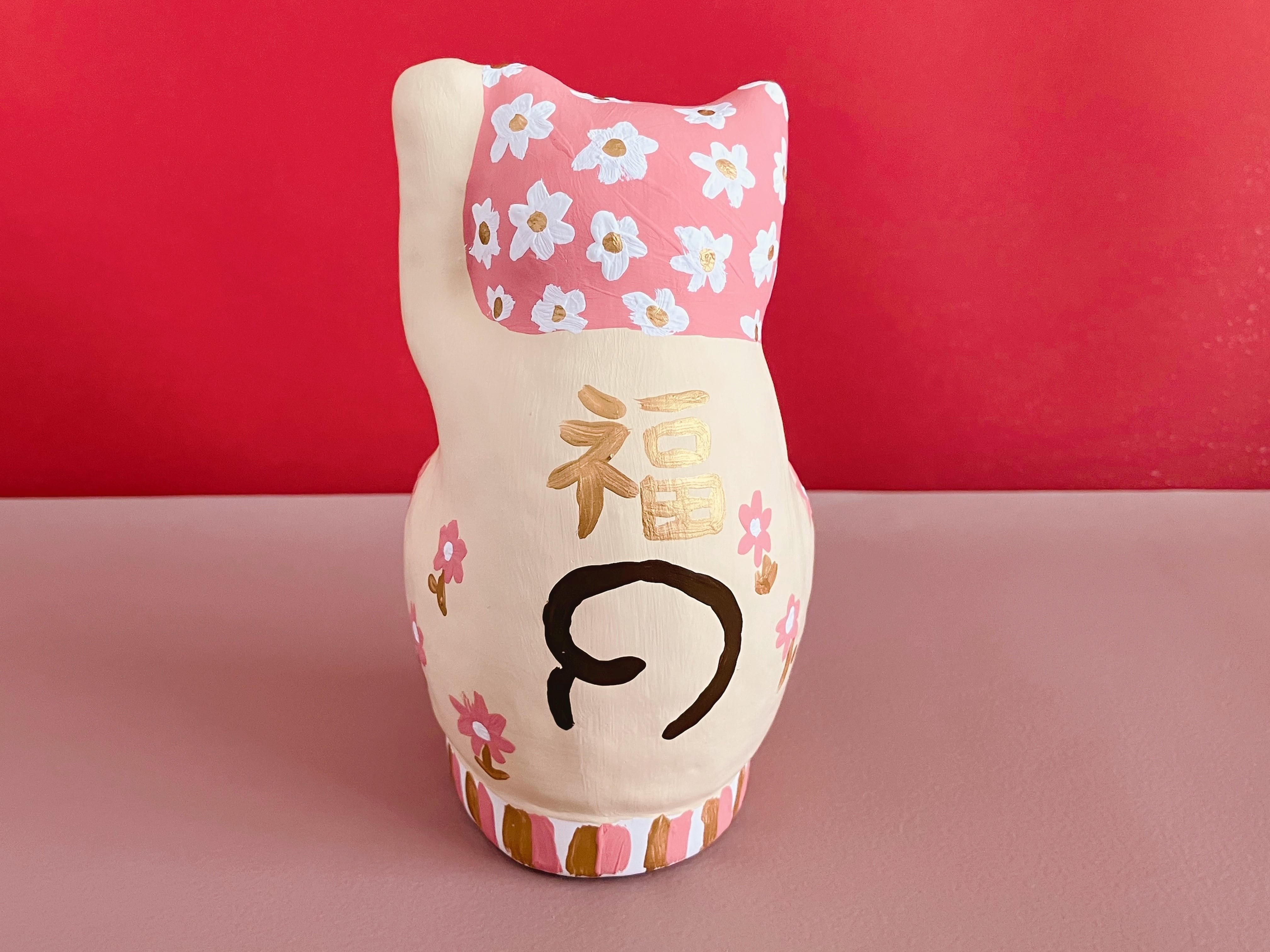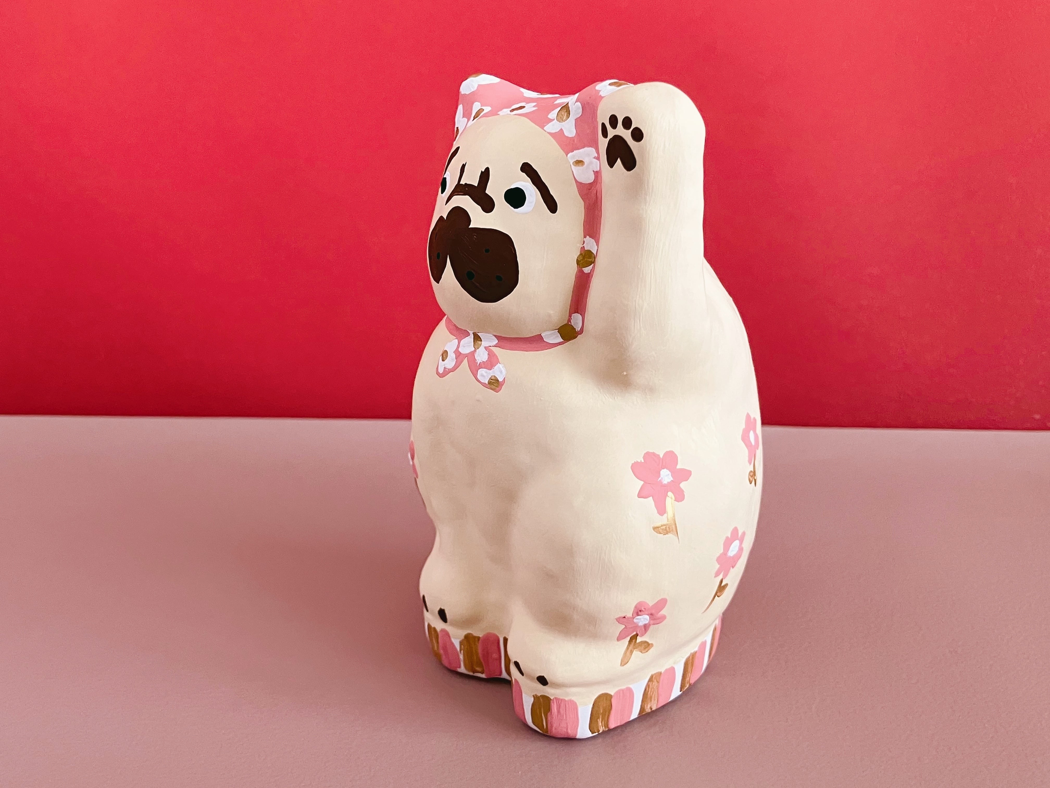 ・はりこの置物は紙製で軽い為土合部分を粘土で張り合わせているものがございます。土でできている為、割れやすくなっておりますので取り扱いに注意してください。