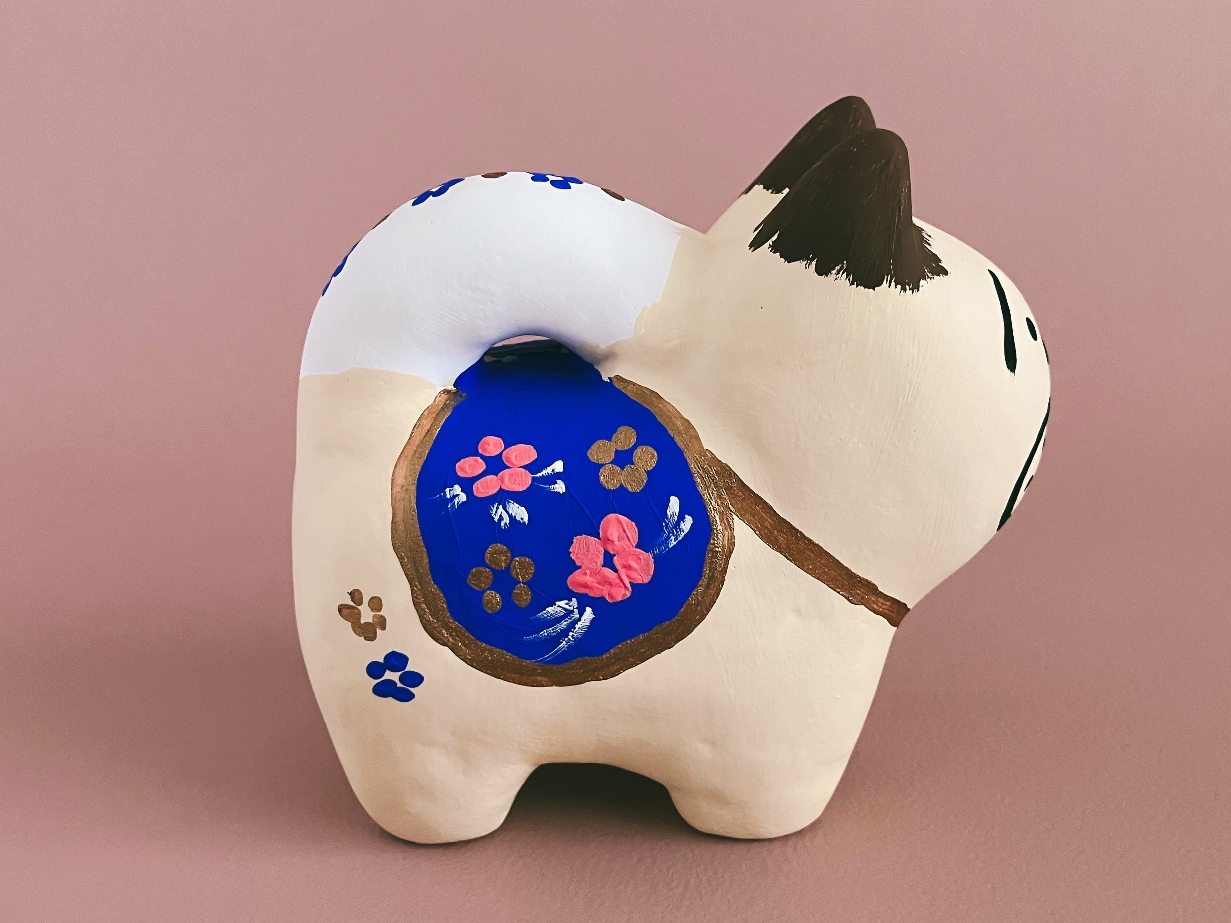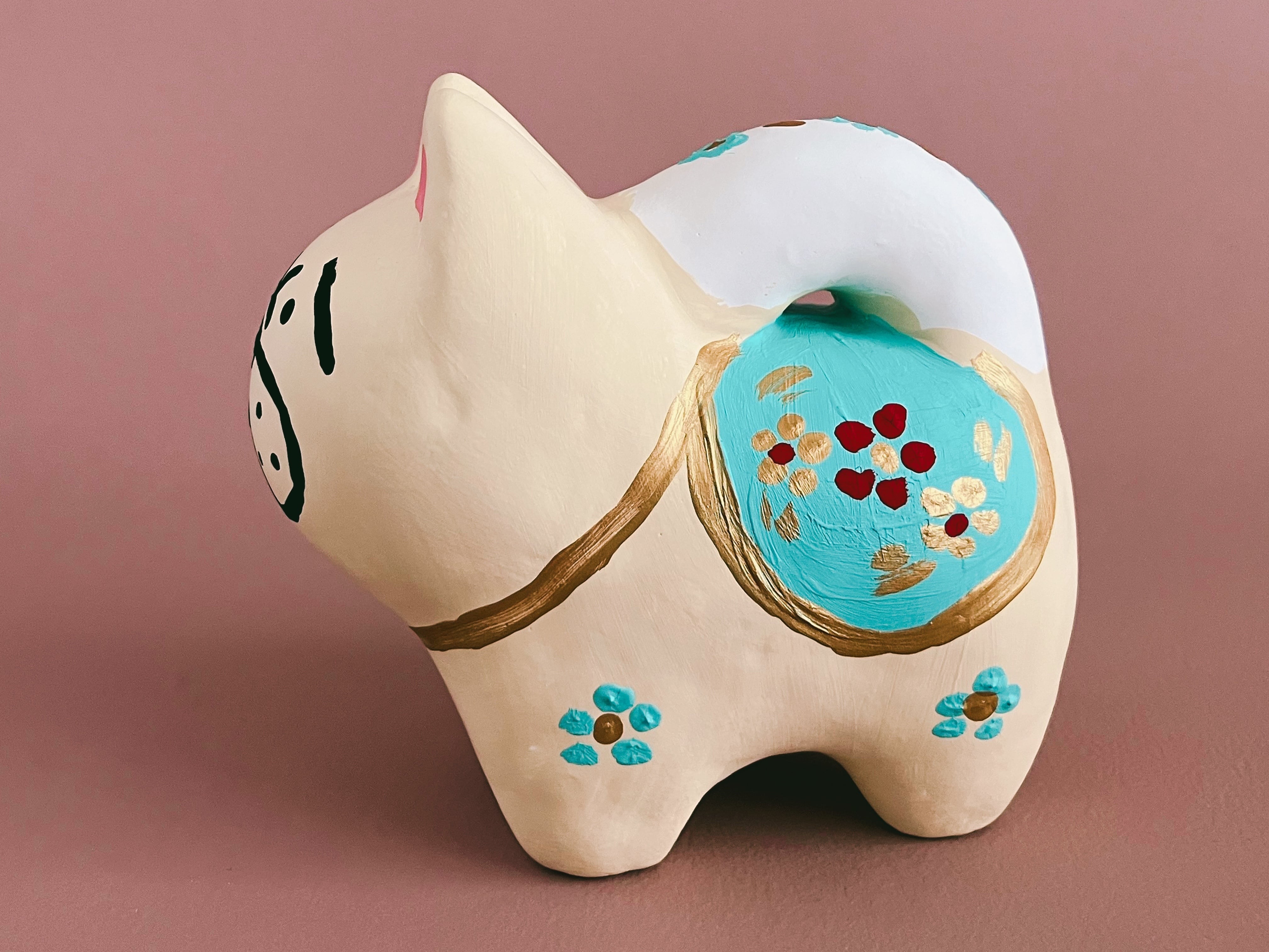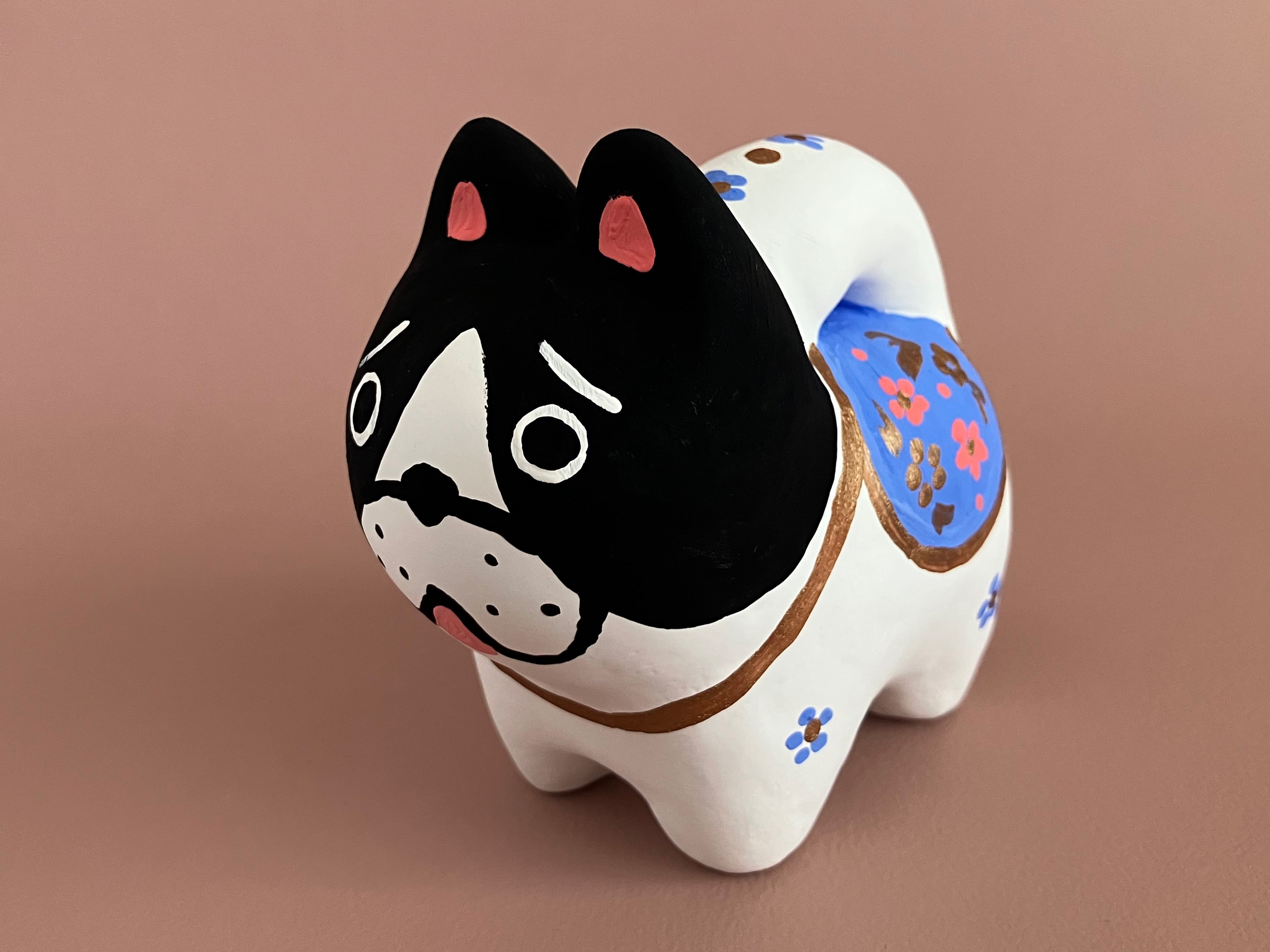 ・はりこの置物は紙製で軽い為土合部分を粘土で張り合わせているものがございます。土でできている為、割れやすくなっておりますので取り扱いに注意してください。